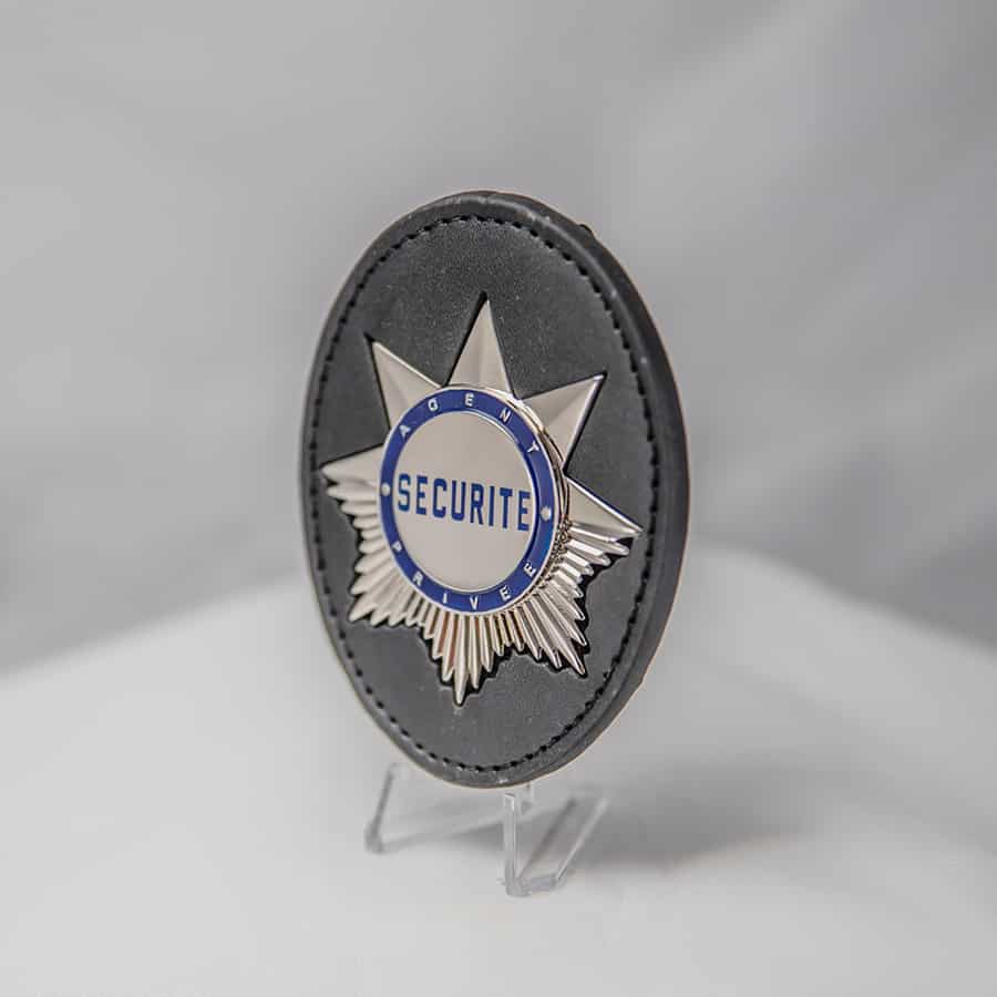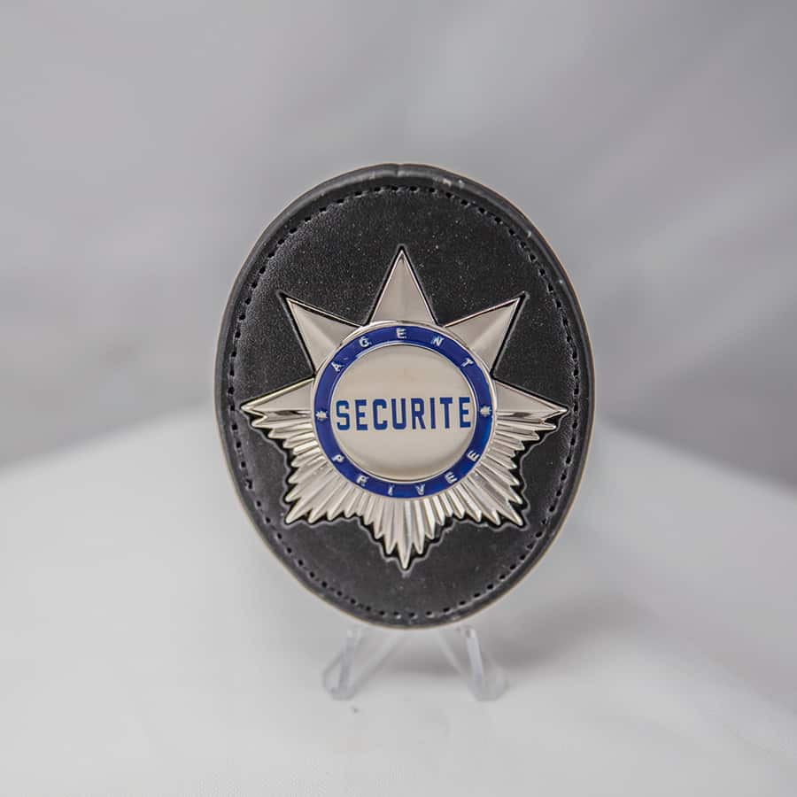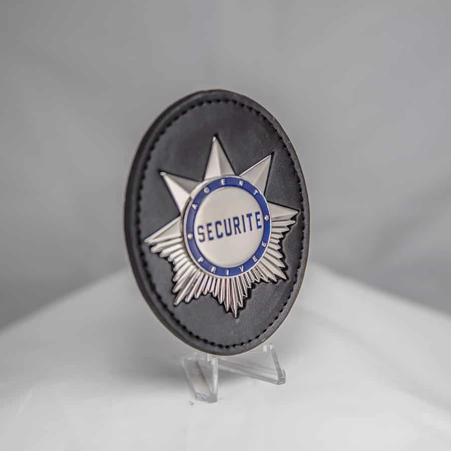 Plaque dédiée aux Agents de sécurité privée montée sur support en cuir avec clip.